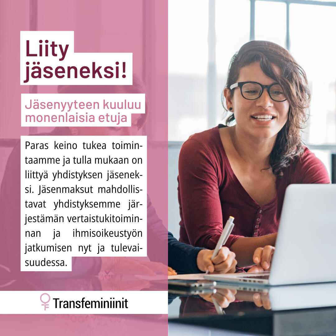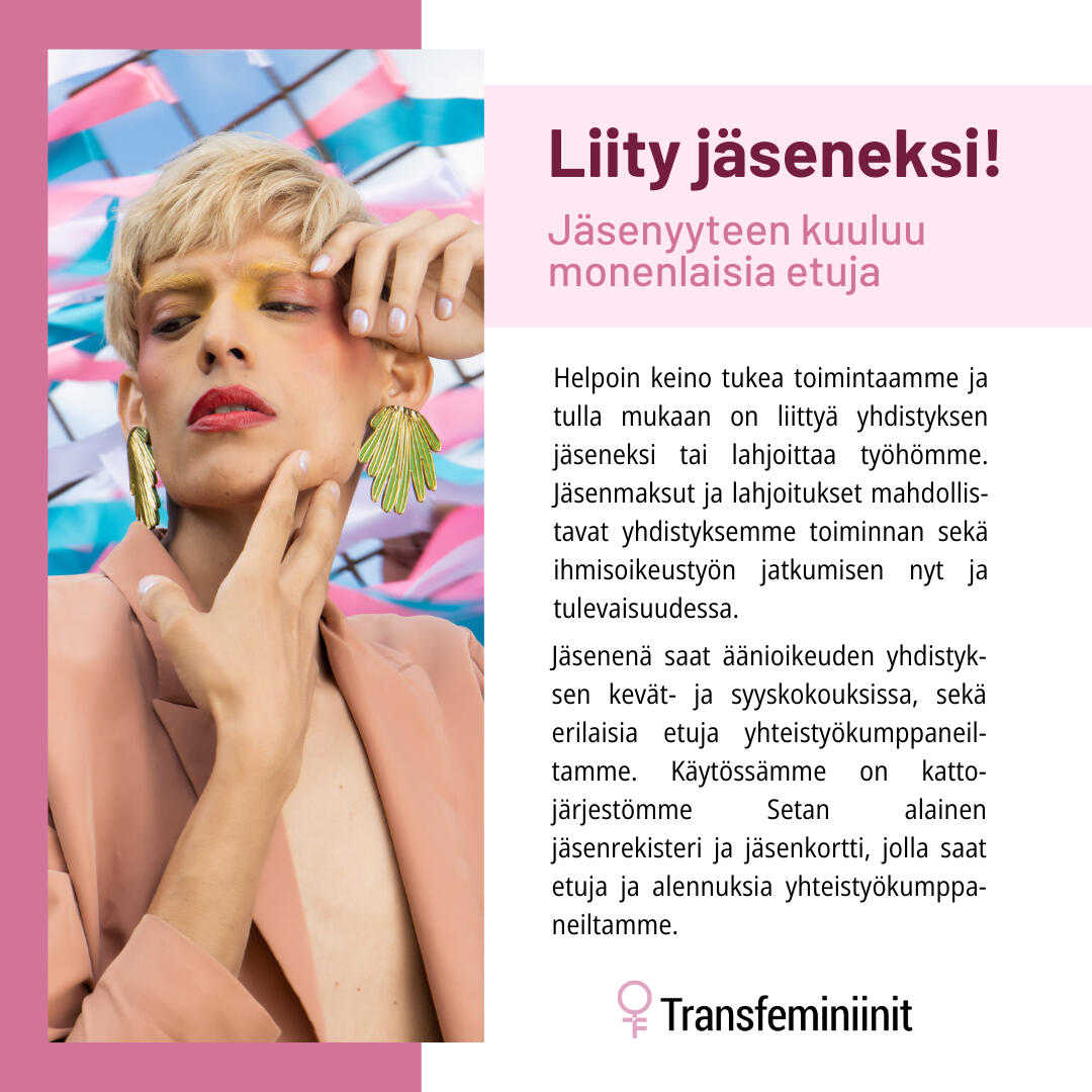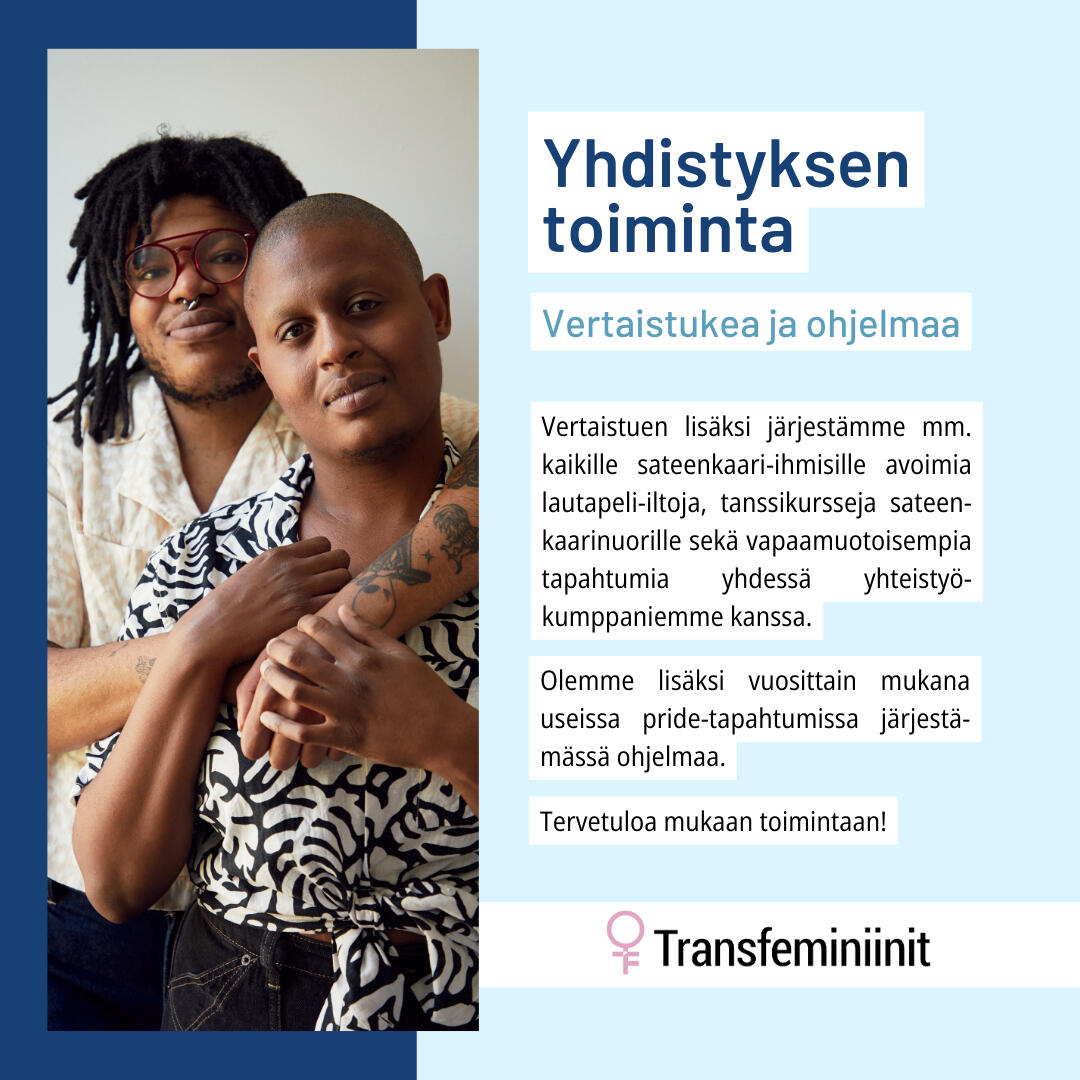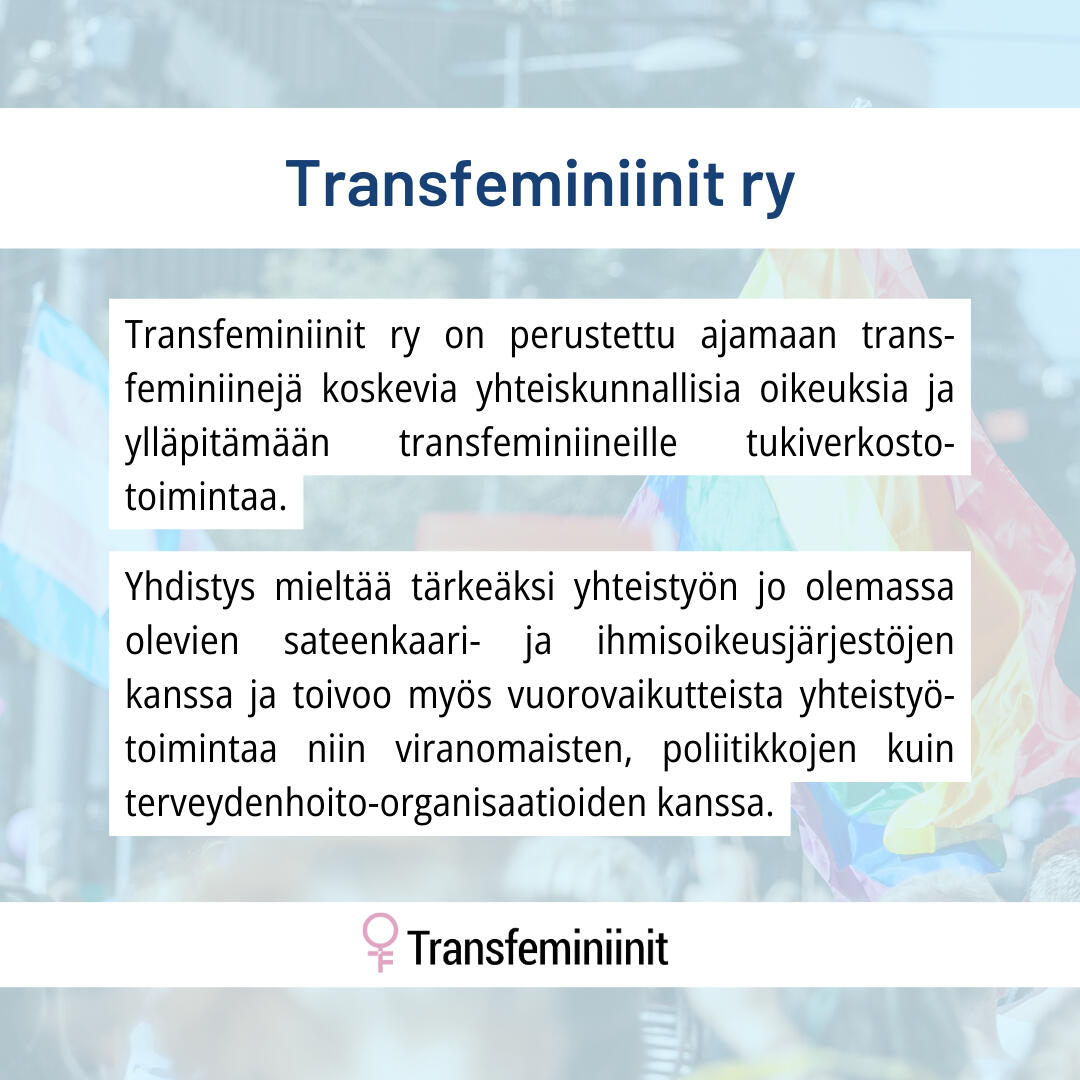 Transfeminiinit ry works for better quality of life and rights for trans people in Finland, Europe and the World by offering peer support in groups and individually to transgender individuals, offering legal advise from a specialised lawyer and working in collaboration with other NGO's, schools, politicians and health care providers.